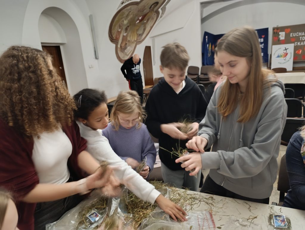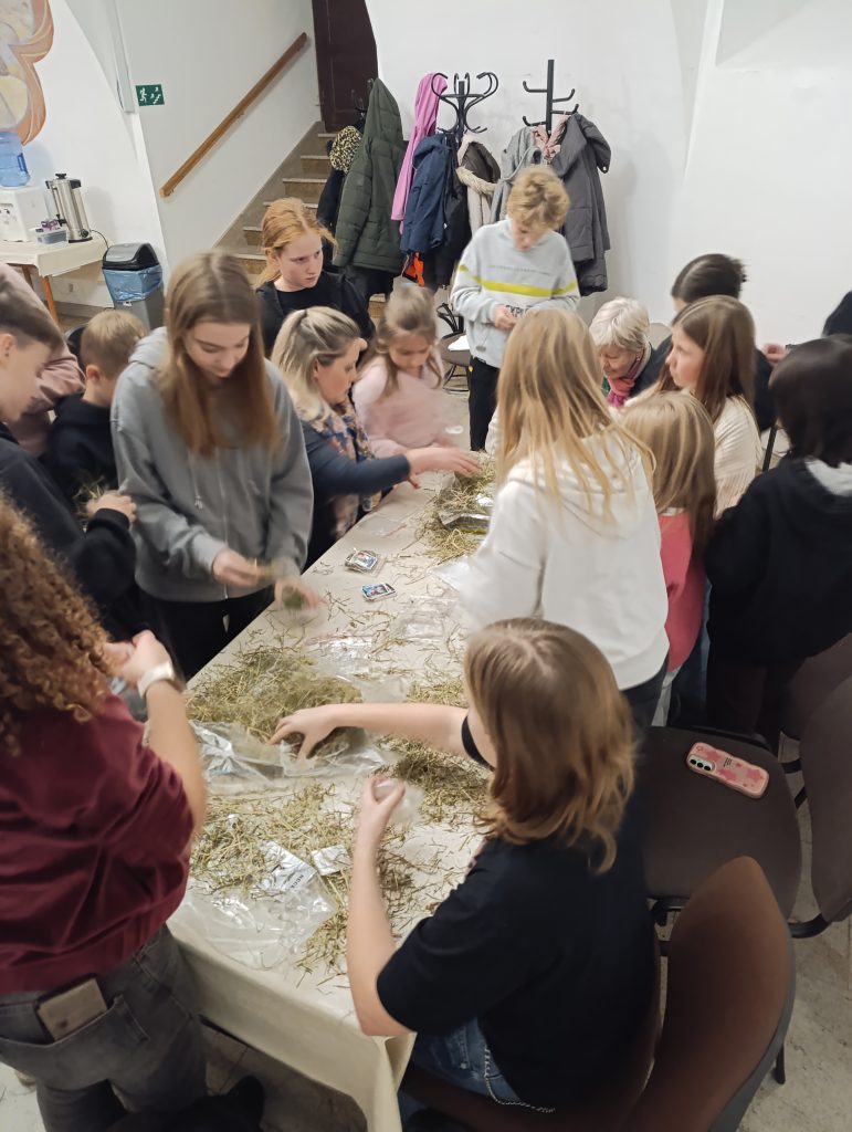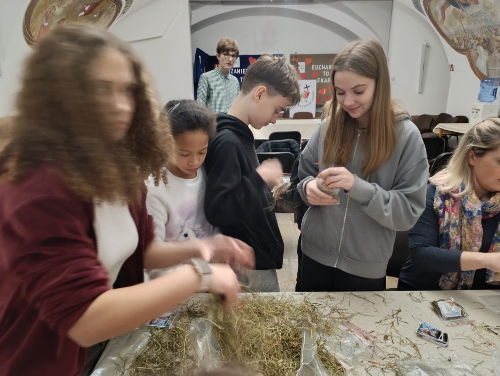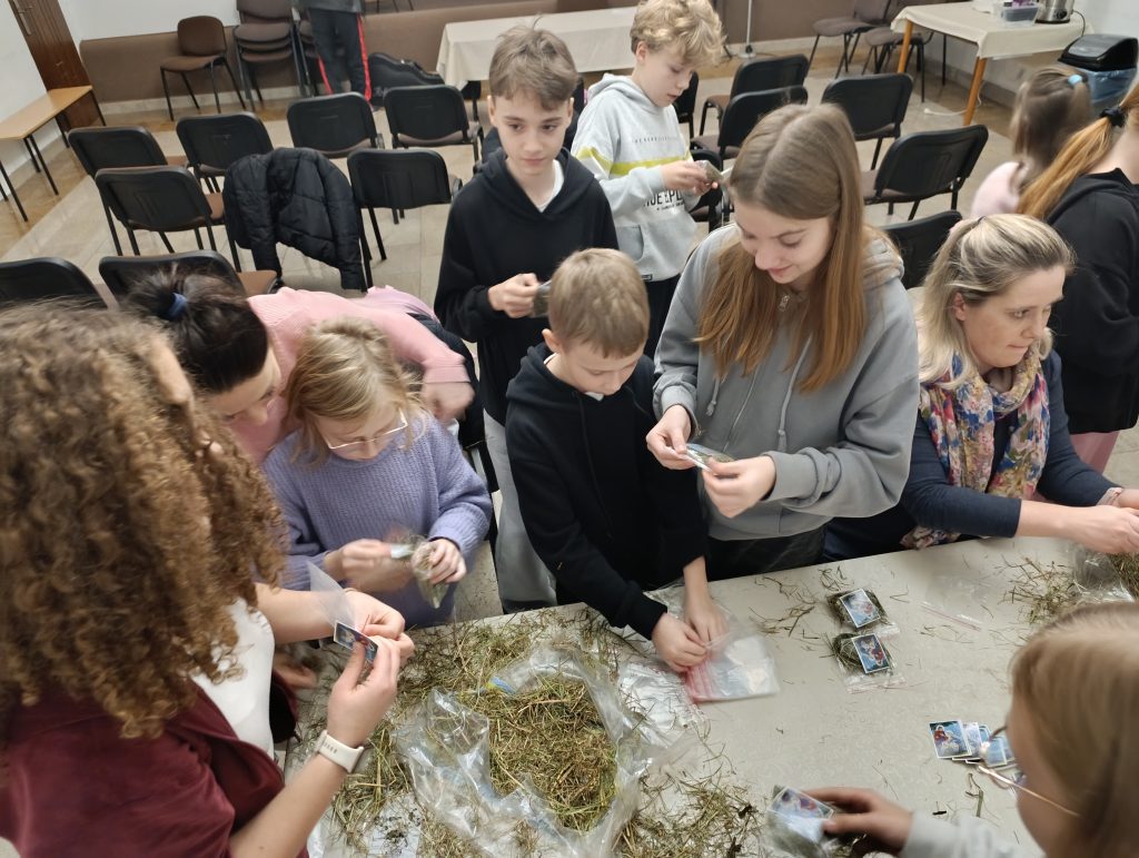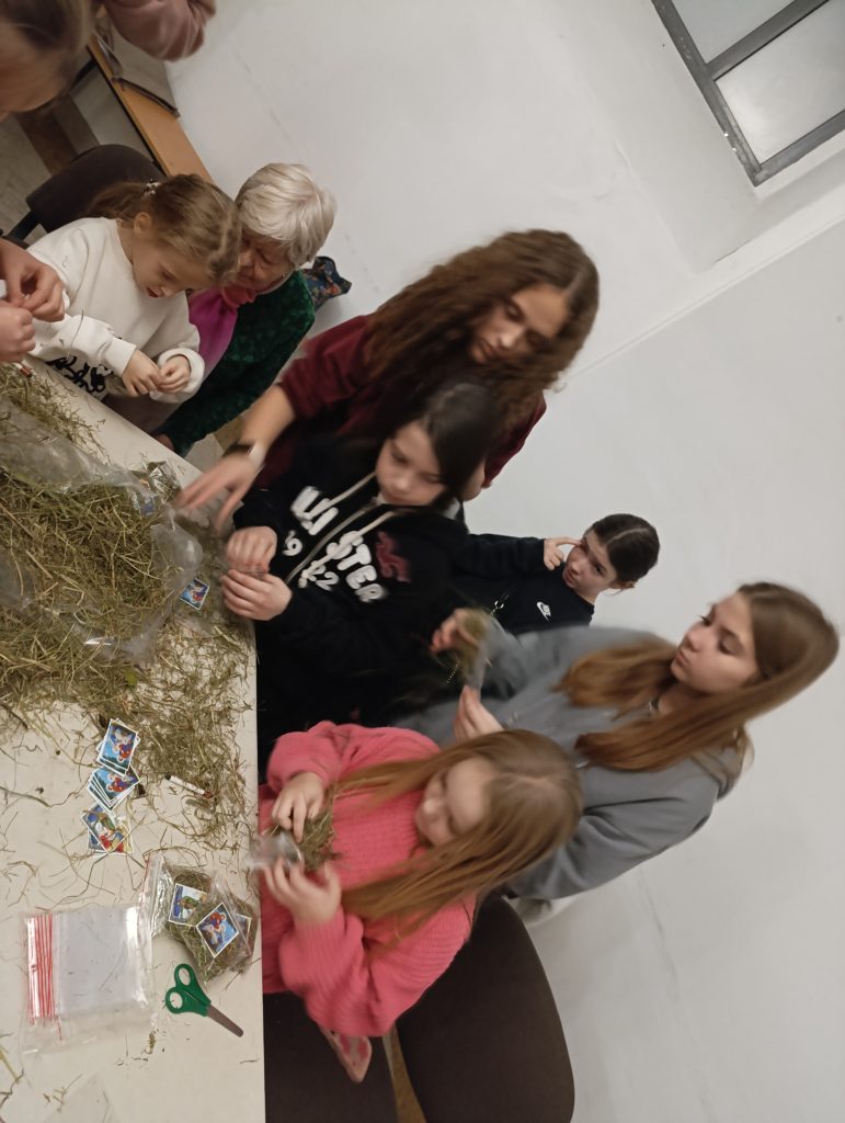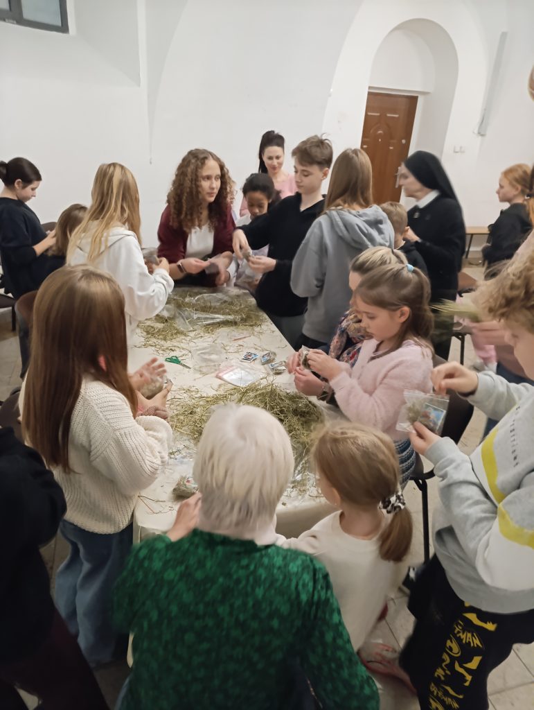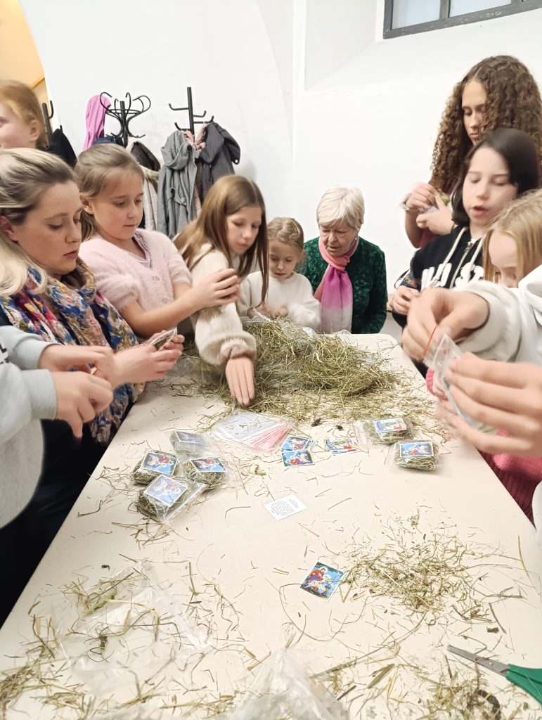 Bielanki razem z rodzicami i dziećmi z Teatru Słowa przygotowały sianko na stół wigilijny.