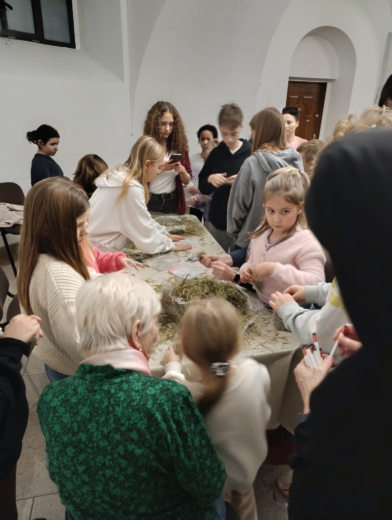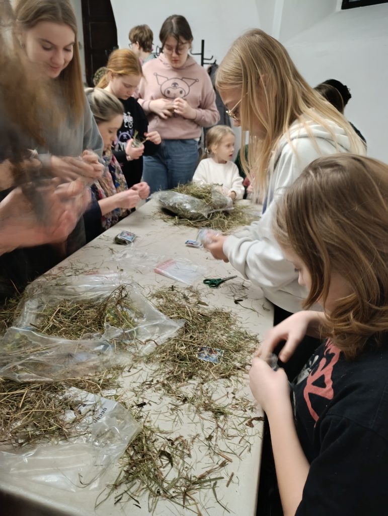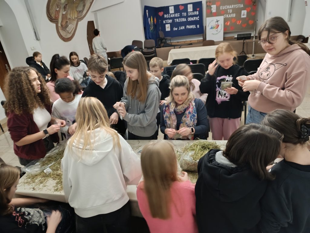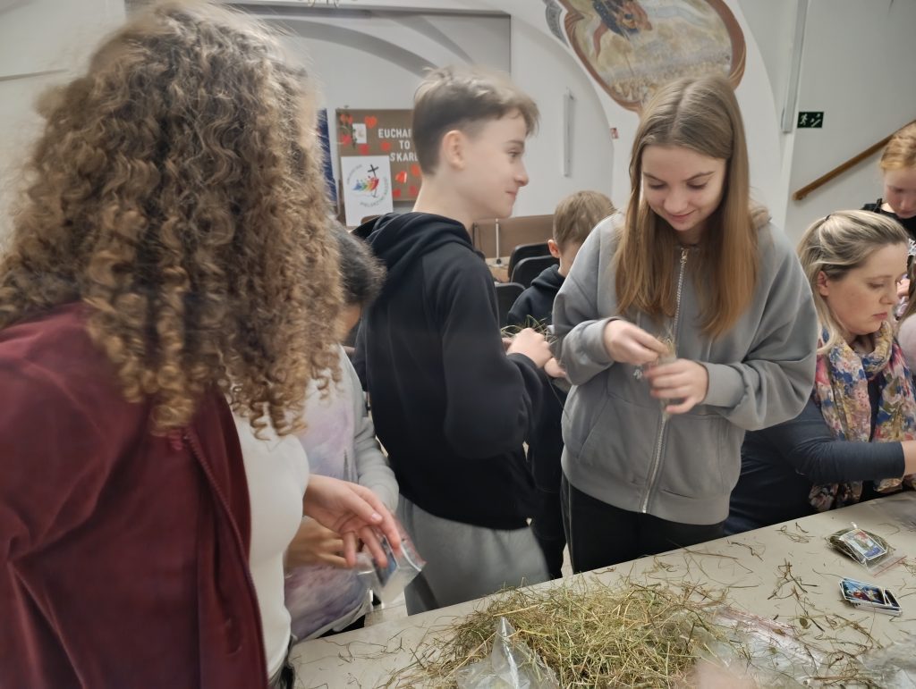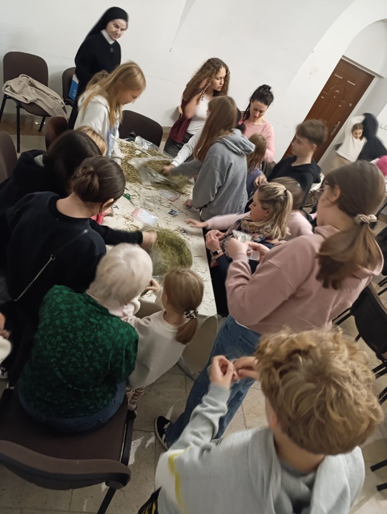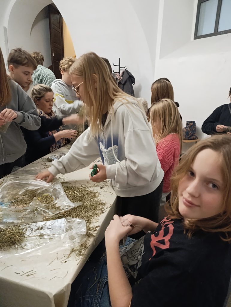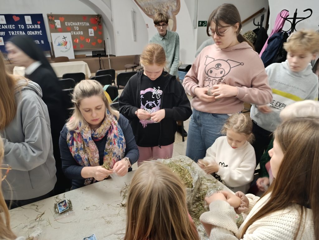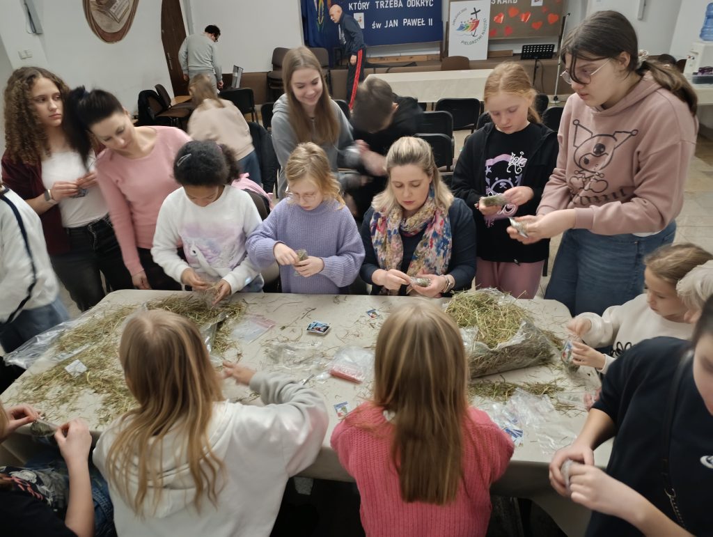 Bielanki razem z rodzicami i dziećmi z Teatru Słowa przygotowały sianko na stół wigilijny.